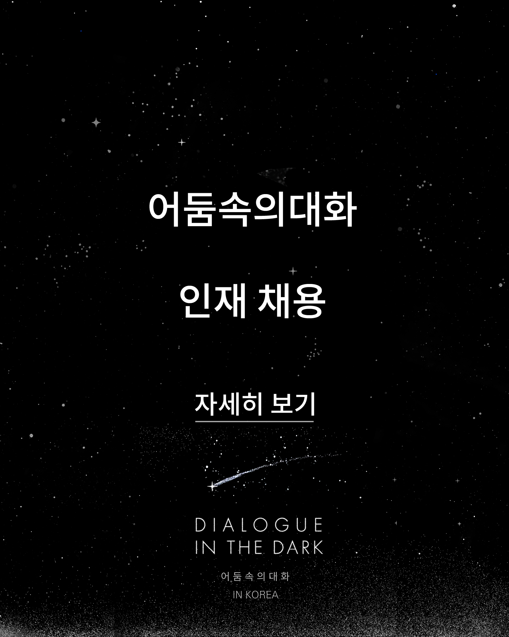 애니메이션 표시중 : 완전한 검은색 배경에 어둠속의대화 영문명인 DIALOGUE IN THE DARK의 D I D를 상징화한 심볼 이미지가 영상으로 출력되고 있습니다. 아무것도 적혀 있지 않은 직사각형으로 형상화된 대문자 I를 두 개의 대문자 D가 포켓처럼 감싸고 있습니다. 잠시 후 두 개의 대문자 D가 어둠속의대화의 문이 열리듯 빛이 나면서 펼쳐지면 대문자 I와 만나 안정적인 반원형이 완성되고, 그 위로 DIALOGUE IN THE DARK 텍스트가 나타났다가 다시 어둠속의대화의 문이 닫히듯 반원이 접히며 처음의 직사각형 심볼이 완성되면서 직사각형 I와 두 개의 D가 겹쳐집니다. 이 영상이 계속 반복됩니다.